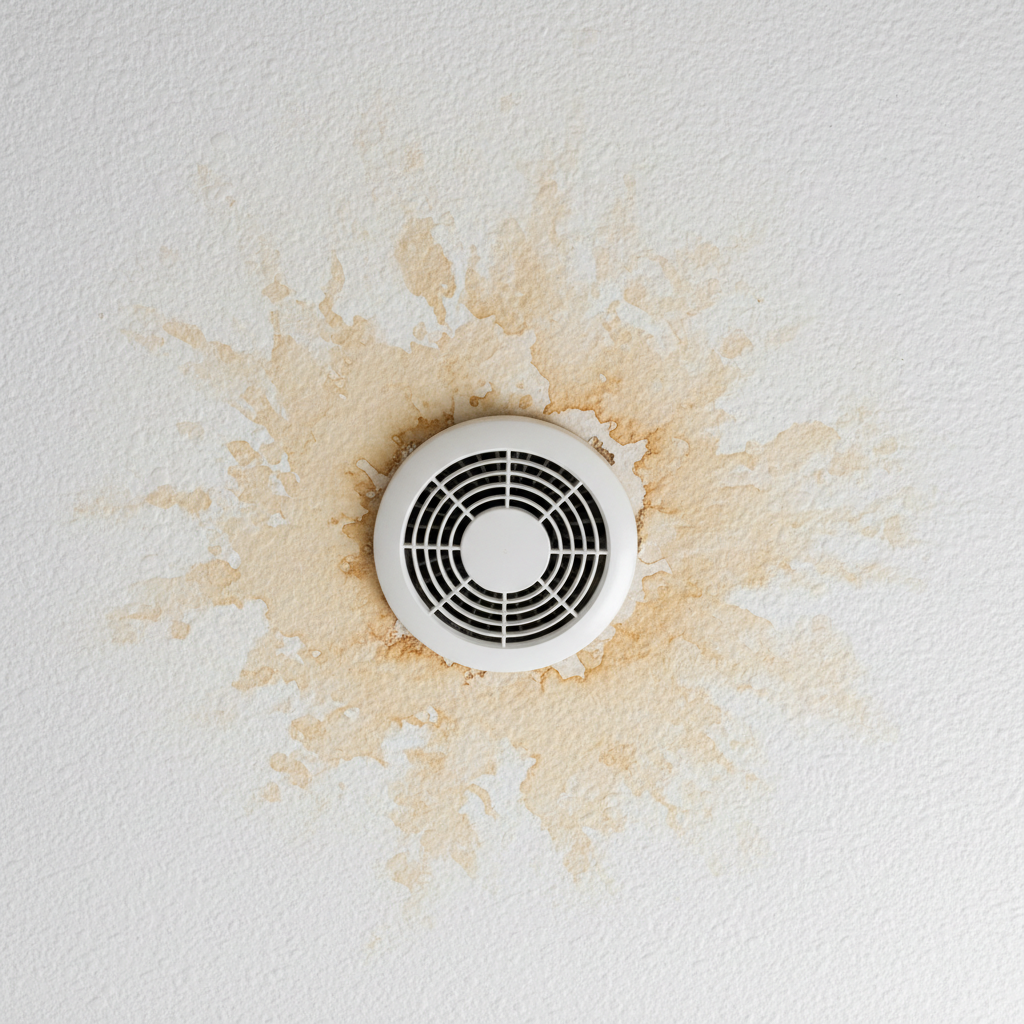 It’s a sight that makes any homeowner’s stomach drop. You look up at the ceiling in your bathroom and see it: a distinct, ugly brown or yellowish ring staining the clean white paint, centered perfectly around your exhaust fan. Immediately, your mind jumps to the worst-case scenario: a roof leak. You picture water seeping in from outside, rotting the sheathing, and a multi-thousand-dollar roofing bill in your near future.