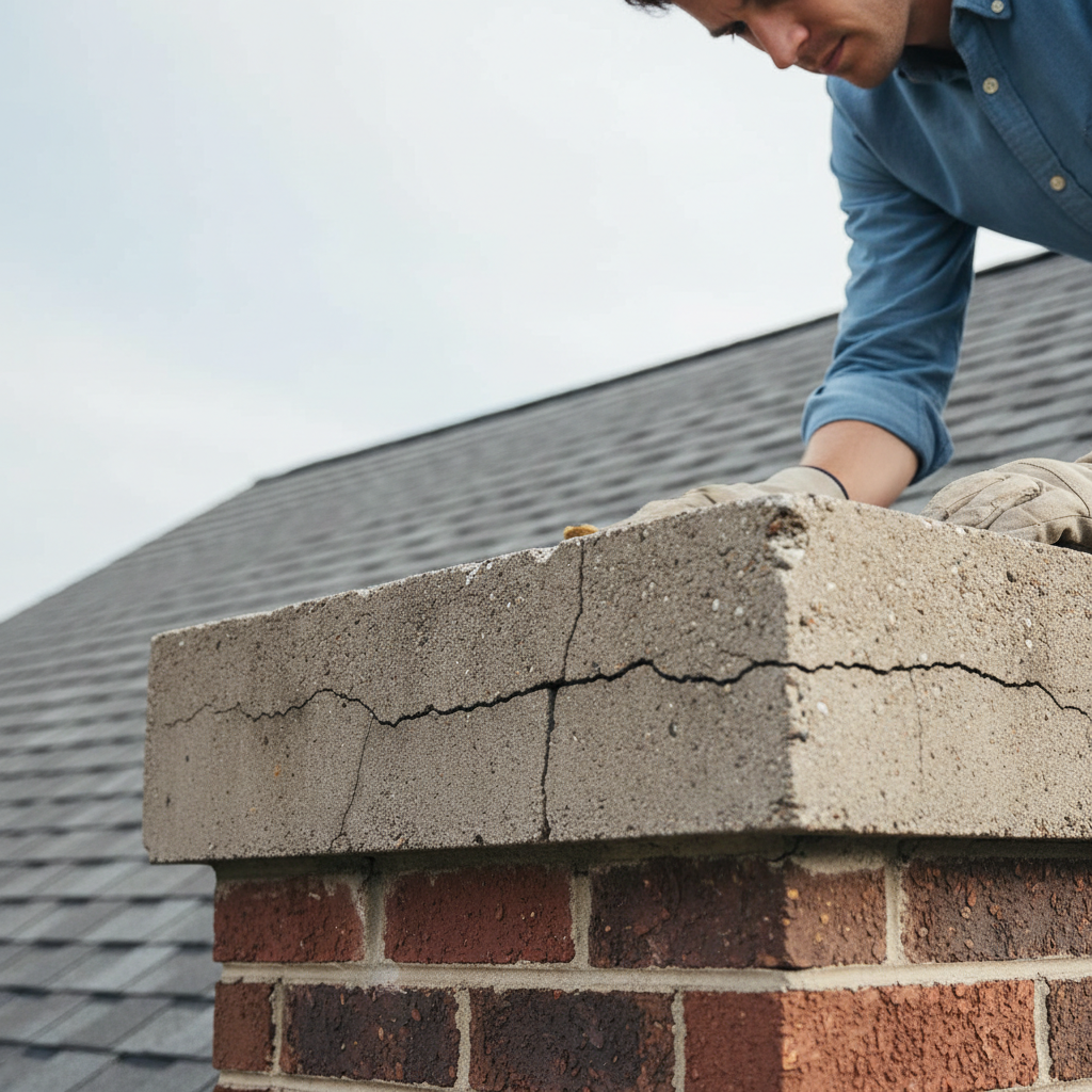 Inspect your chimney crown from the roof (if safe) or with binoculars from the ground. Look for visible cracks (hairline to large), crumbling concrete, pitting, or pieces breaking off. Also, check if water is staining the brickwork directly below the crown after rain.