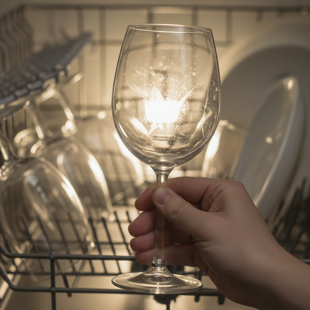 The white, chalky film on your dishes is typically one of two things: hard water mineral deposits (calcium and magnesium) or permanent etching of the glass. To figure out which it is, soak a cloudy glass in white vinegar for 5 minutes. If the film disappears, you have a hard water problem that can be fixed by cleaning your dishwasher and using a rinse aid. If the film remains, the glass is permanently etched and cannot be restored.