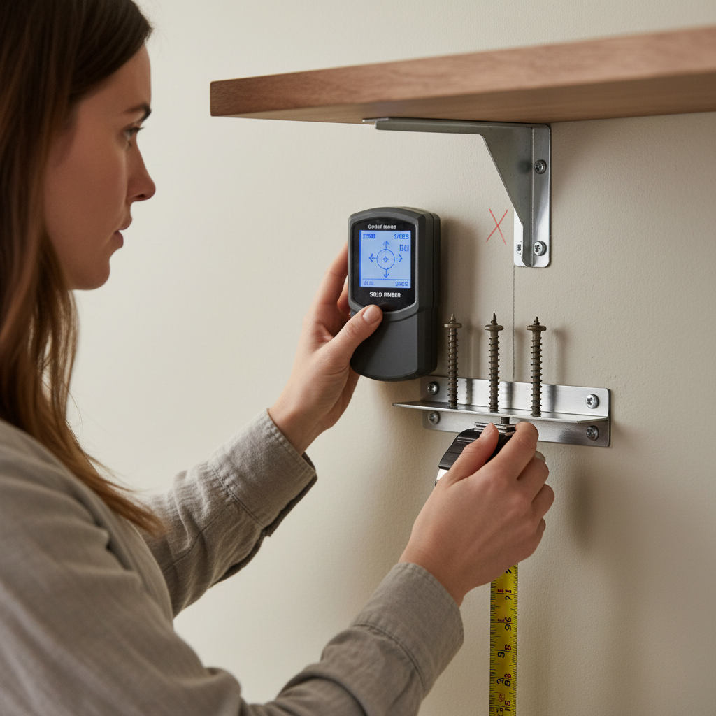 2. Locate Wall Studs Accurately — Use a stud finder to identify the precise center of each wood stud within your chosen shelf area.