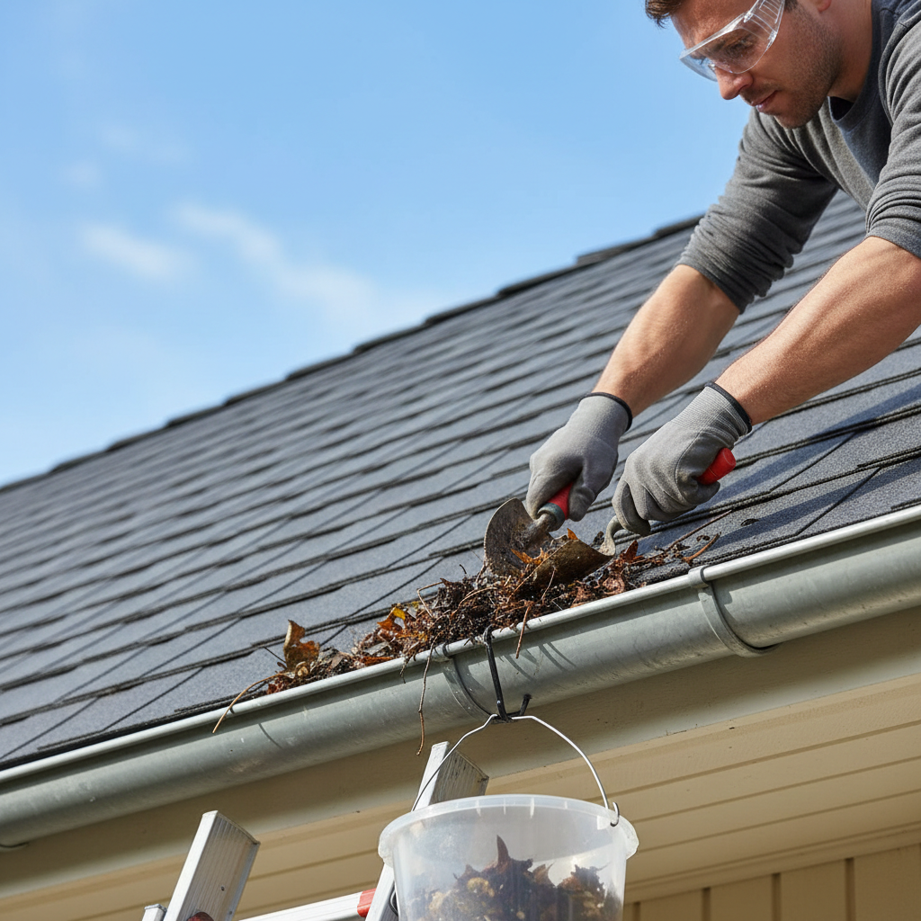 - Remove Large Debris: Starting at one end of a gutter section, use your gloved hands or a small trowel to scoop out larger pieces of leaves, twigs, and muck. Deposit the debris into your bucket. Work slowly and methodically along the entire length of all gutters.