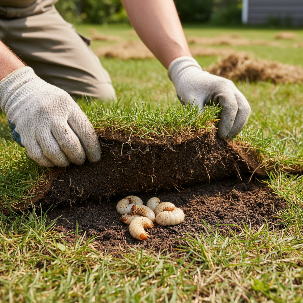 Confirm Grub Presence: Cut a 1-foot square flap of sod about 2-4 inches deep in several affected and surrounding areas. Fold back the sod and count the grubs. More than 5-10 grubs per square foot indicates a damaging infestation that requires treatment.