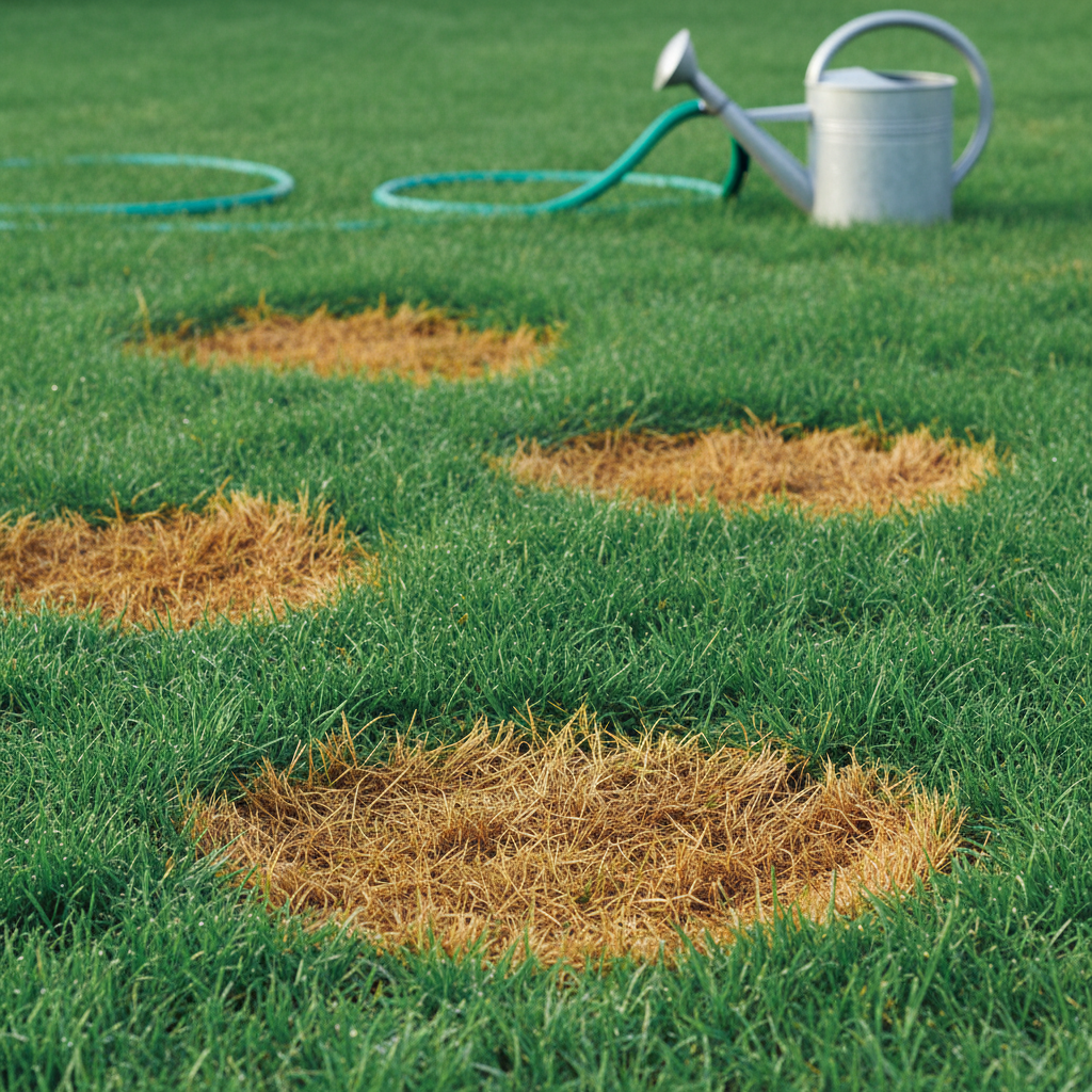Common fungal diseases that cause brown spots after watering include Brown Patch, characterized by large, irregular brown patches with a dark border, and Dollar Spot, which produces small, circular, straw-colored spots often with a web-like growth in the morning dew. Pythium blight is another, appearing as greasy, dark patches.